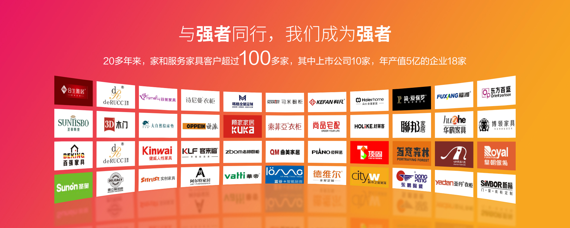 專注大家居行業(yè)多年,與業(yè)內(nèi)歐派、尚品宅配、索菲亞等眾多優(yōu)勢(shì)品牌結(jié)成戰(zhàn)略合作伙伴關(guān)系。